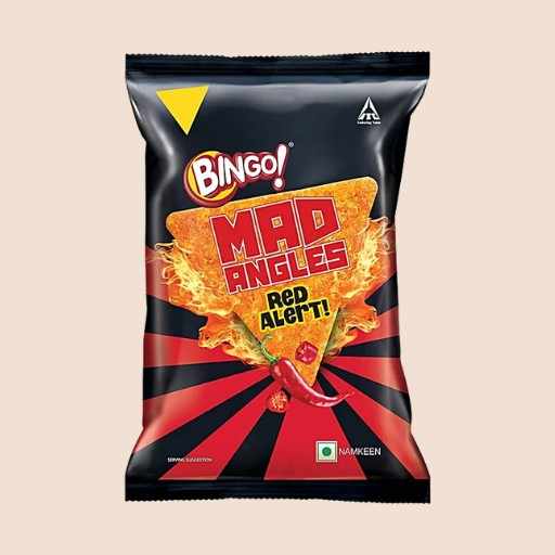 Product TypeTriangular Corn-Based Crisps/Chips (often called a namkeen or savory snack in India).Flavor ProfileRed Alert! is known for its fiery, bold, and intensely spicy flavor, appealing to those who love a hot kick in their snacks.Key Physical FeatureThe chips have a distinctive, perfect triangular shape, which is the signature of the “Mad Angles” line.TextureThey are designed to be ultra-crunchy and crispy, offering a satisfying and loud bite.Ingredients BaseMade from a combination of rice, corn, and gram grits, giving it a texture distinct from traditional potato chips.Dietary NoteThe product is 100% vegetarian.