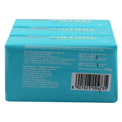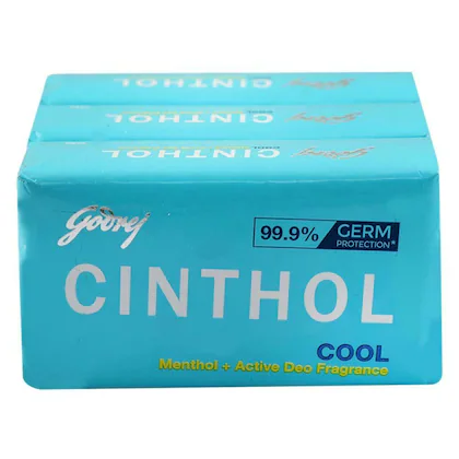 Cinthol Cool is a refreshing bathing soap designed to provide an invigorating shower experience with germ protection. It is infused with Icy-Cool Menthol and an Active Deo Fragrance to help you beat the heat, stay fresh, and feel confident throughout the day. The soap is generally suitable for all skin types and is promoted for effective cleansing.