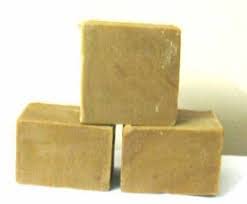 This appears to be a handmade or traditionally-made natural bar soap. The square shape, solid texture, and matte, earthy color suggest a product crafted using a cold or hot process method, often involving natural oils and minimal processing. It resembles traditional soap types like unscented lye soap or natural bars colored with clays or ingredients like brown sugar, cocoa, or natural spices.