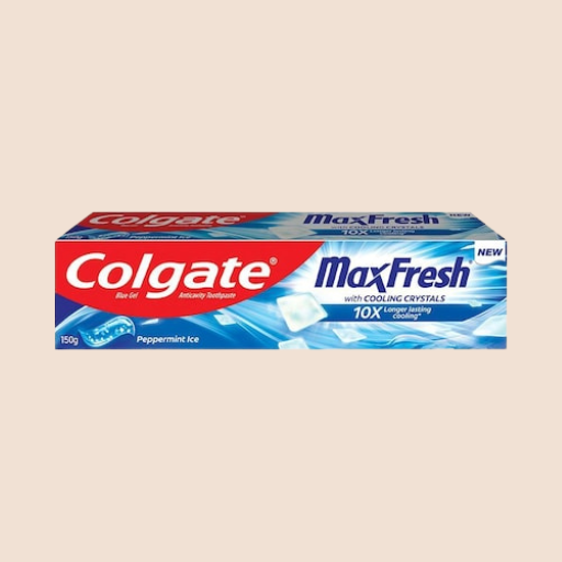 Colgate MaxFresh Peppermint Ice is a blue gel toothpaste infused with unique cooling crystals that dissolve as you brush, providing an intense, long-lasting blast of freshness. Its refreshing peppermint ice flavor helps you feel energized and ready to start your day.