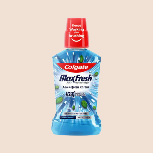 Colgate MaxFresh Plax is a peppermint-flavored mouthwash that provides a powerful blast of freshness. It is a no-alcohol formula that works to remove 99% of germs, providing a clean and fresh mouth. The mouthwash is designed to keep working after brushing to extend the feeling of freshness and cleanliness.