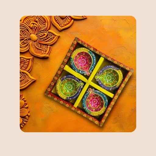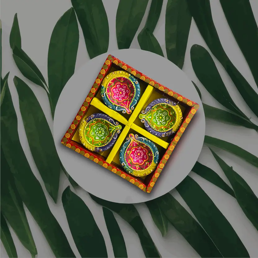 Colourful Designer Clay Big Size Diya For Diwali Pooja set 4 Earthenware Table Diya Set