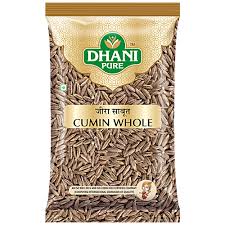 This product is Dhani Pure Cumin Whole (Jeera Sabut), an essential whole spice for Indian cooking, known for its warm, earthy, and nutty aroma and flavor. It is 100% natural, is free from artificial colors and preservatives, and is responsibly sourced.