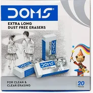 The DOMS Extra Long Dust Free Erasers are premium-quality, white vinyl erasers specifically designed for clean and clear erasing of graphite pencil marks. Their special “dust-free” formulation minimizes the residue left behind, ensuring a clean workspace. The “Extra Long” size provides an improved grip and a longer lifespan. The box shown contains 20 individual pieces.