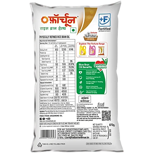 Fortune Rice Bran Oil is a premium, heart-friendly cooking oil naturally enriched with Gamma Oryzanol. This unique antioxidant is known to help lower bad cholesterol and promote overall cardiovascular health. The oil is also fortified with Vitamins A & D, making it a nutritious choice for your family.