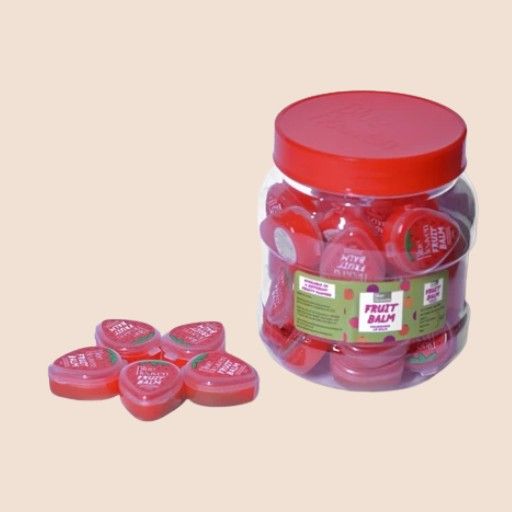 Fruit Balm is a nourishing lip balm that comes in a fun, fruit-shaped container. It is designed to hydrate and protect dry, chapped lips, leaving them soft and smooth with a subtle, fruity scent. The product is often sold in a bulk pack, as seen in the image, making it a popular choice for personal use, gifting, or resale.