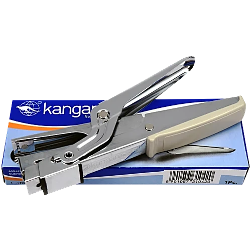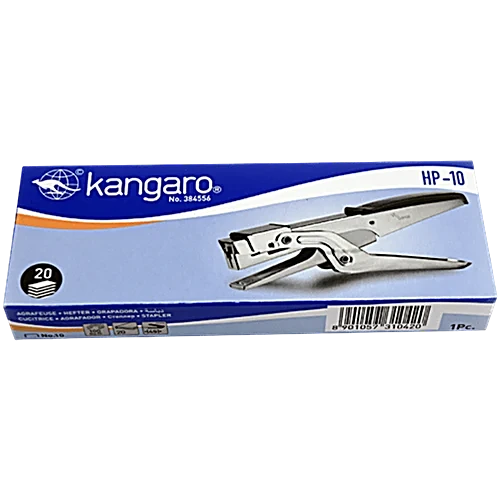 classic, plier-type (or ‘gun-type’) office or household stapler by Kangaroo, model HP-10, featuring a durable, polished metal construction for comfortable, handheld stapling.