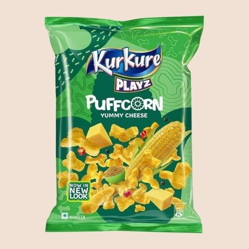 Kurkure Playz Puffcorn Yummy Cheese is a popular Indian savoury snack (“Namkeen”) made of light, airy, and fluffy puffed corn. It is generously coated with a rich, tangy, and irresistible “Yummy Cheese” seasoning, offering a delightful cheesy crunch.