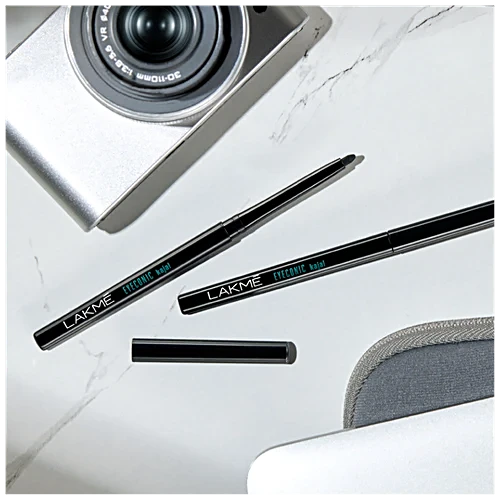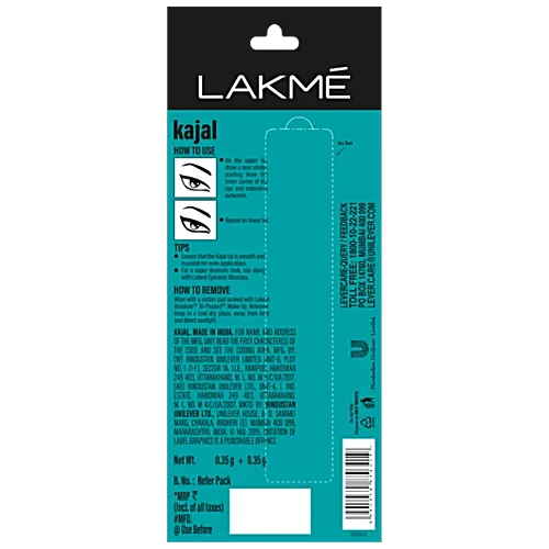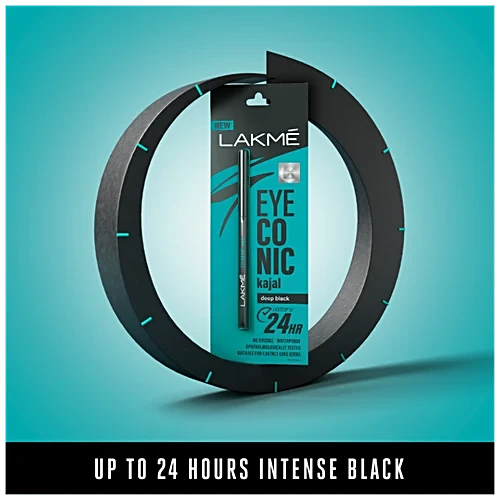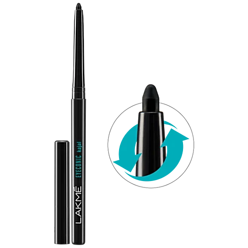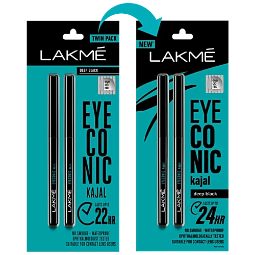 The Lakmé Eyeconic Kajal is a versatile eye pencil known for its intense black color and long-lasting formula. This twin pack offers two of these kajals, which are smudge-proof and waterproof. The product is designed for easy, one-stroke application to create various looks, from a subtle line to a bold, eyeconic wing. The new formulation provides a longer wear time, and it is safe for contact lens users.
