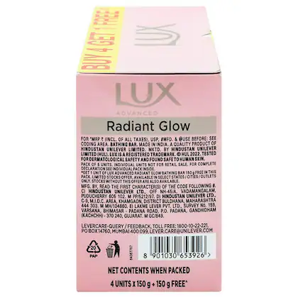 LUX Advanced Radiant Glow is a beauty soap bar enriched with Rose, Vitamin C, and Vitamin E to give the skin a soft, smooth, and visibly radiant glow. It gently cleanses while leaving a captivating and long-lasting floral fragrance.