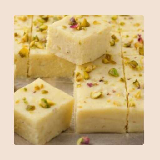 Milk Cake, also known as Alwar ka Mawa, is a traditional Indian sweet made by slowly cooking milk and sugar until it crystallizes and forms a dense, grainy fudge. This sweet has a rich, caramelized flavor and a distinct layered texture. It is often garnished with pistachios and cardamom, making it a beloved treat for celebrations.