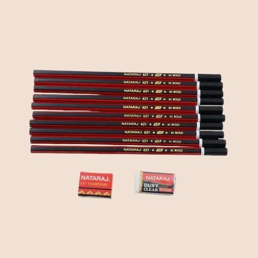 The Nataraj 621 Pencil is a classic graphite pencil designed for smooth and clear writing. This product is a pack that includes ten pencils, along with a sharpener and a “Dust Clear” eraser. The pencils are made with high-quality wood and lead, providing a comfortable and effective writing and drawing experience.