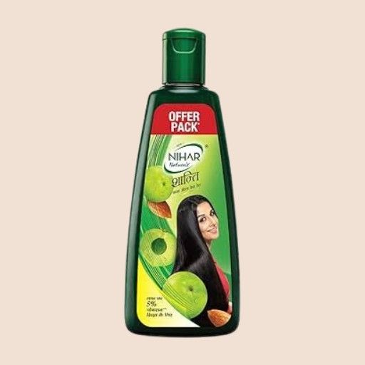 Nihar Naturals Shanti Amla Badam Hair Oil is a hair oil designed to nourish hair and promote strength and shine. The oil is a blend of Amla (Indian gooseberry) and Badam (almond) and is known for its non-sticky formulation. The product is packaged in a 300ml bottle with a green cap and a label showing a woman with healthy, black hair.