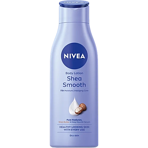 This is the Shea Smooth Body Lotion from NIVEA, an indulging care moisturizer specifically formulated for dry skin. It features an improved formula that promises to deeply nourish and lock in moisture for up to 72 hours. The lotion is enriched with a blend of Pure Hyaluron, Shea Butter, and NIVEA’s Deep Nourish Serum. It is designed to be quick-absorbing and non-greasy, melting into the skin to leave it feeling silky smooth, soft, and healthy-looking.