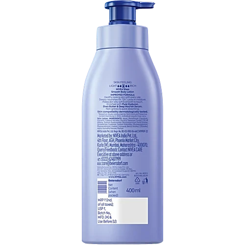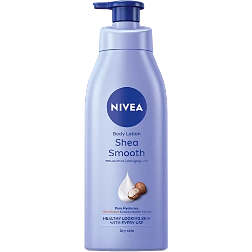 This is the Shea Smooth Body Lotion from NIVEA, an indulging care moisturizer specifically formulated for dry skin. This larger version comes in a convenient pump bottle for easy, mess-free application. It features an improved formula that promises to deeply nourish and lock in moisture for up to 72 hours. The lotion is enriched with a blend of Pure Hyaluron, Shea Butter, and NIVEA’s Deep Nourish Serum. It is designed to be quick-absorbing and non-greasy, melting into the skin to leave it feeling silky smooth, soft, and healthy-looking.