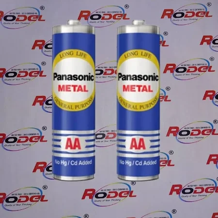 The product is a pack of two Panasonic METAL General Purpose AA Batteries. These are standard, non-rechargeable (primary) dry-cell batteries specifically designed to offer an economical and dependable power source for low-drain household electronic devices. The background image includes the logo for Rodels, which appears to be the distributor or brand selling this specific packaging.