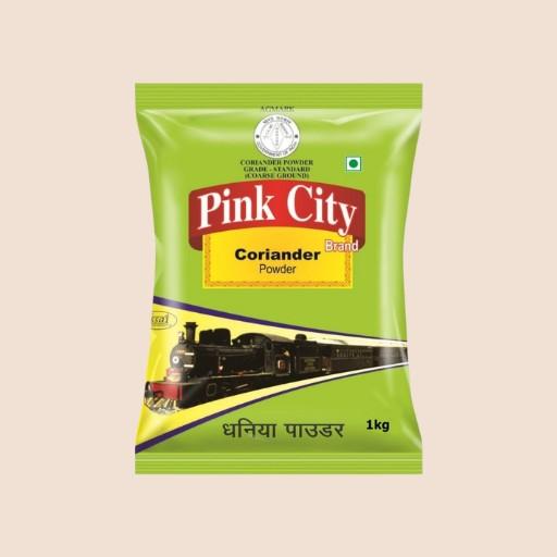 This product is Pink City Brand Coriander Powder (Dhania Powder), a staple Indian spice made from ground, sun-dried coriander seeds. It is manufactured by Pink City Mills (PCM), a leading spice brand from Rajasthan, India, known for its authenticity and quality. It is widely used in Indian cuisine to add a mild, earthy, and slightly citrusy flavor and aroma to dishes. The packaging indicates a 1kg net weight.