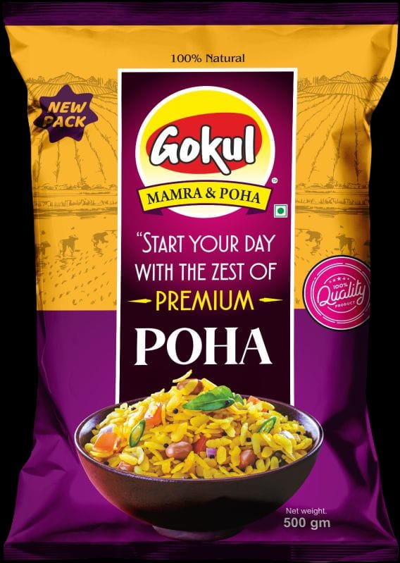 This is a retail bag of Gokul Mamra & Poha, a combination pack of two popular Indian grains: Poha (flattened rice/rice flakes) and Mamra (puffed rice). The product is marketed as 100% Natural, premium quality, and designed to be a healthy and versatile base for Indian breakfast and snack dishes. The net weight of the package shown is 500 gm.