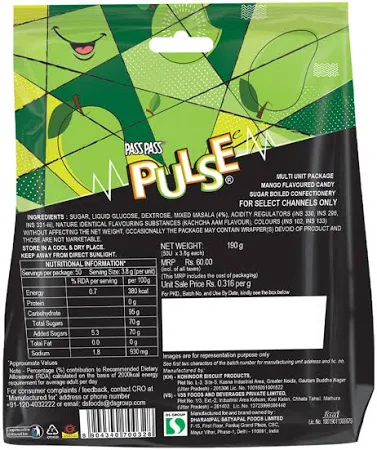 Pass Pass Pulse is a popular, sugar-boiled confectionery that offers a unique, multi-stage taste experience. It starts with the sweet and fruity flavor of raw mango (Kaccha Aam) and features a tangy, spicy powder filling at its core that provides a surprising “Tangy Twist”.