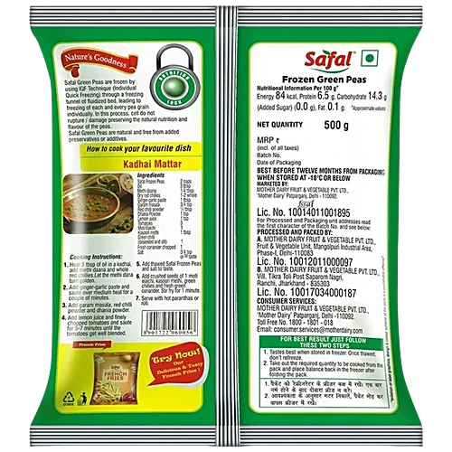 Add a burst of sweetness, vibrant colour, and nutrition to your meals, any day of the year! With Safal Frozen Green Peas, you get the finest, most tender peas, carefully selected and frozen to perfection to lock in their natural goodness. A staple in Delhi kitchens for over 25 years, Safal brings you the promise of quality and convenience you can always rely on.