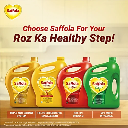 Saffola Gold is a “Pro-Healthy” refined cooking oil that is a unique blend of Rice Bran Oil and Corn Oil. This multi-source edible oil is fortified with essential Vitamins A & D, providing a balanced ratio of Omega-3 and Omega-6 fatty acids to support your family’s heart health.