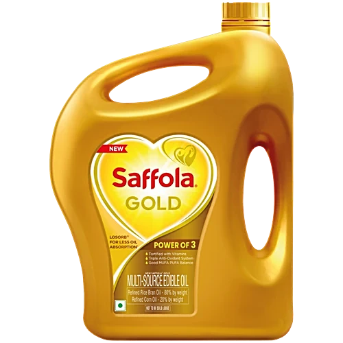 Saffola Gold is a “Pro-Healthy” refined cooking oil that is a unique blend of Rice Bran Oil and Corn Oil. This multi-source edible oil is fortified with essential Vitamins A & D, providing a balanced ratio of Omega-3 and Omega-6 fatty acids to support your family’s heart health. What makes it stand out is its innovative LOSORBâ„¢ Technology, which ensures your food absorbs up to 20% less oil, making every meal lighter and healthier without compromising on taste.