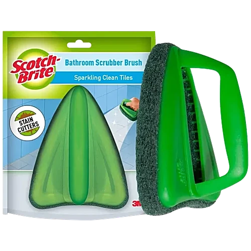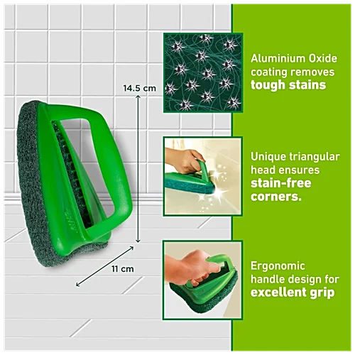 A triangular-shaped, handled bathroom scrubber brush by Scotch-Brite, specifically designed for cleaning tiles to achieve a “Sparkling Clean” finish.