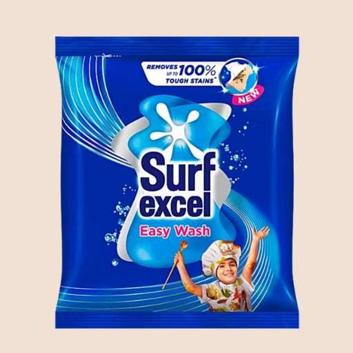 The product is Surf Excel Easy Wash detergent powder, shown in a small, low-cost sachet (priced at ₹10/-). It is a popular laundry detergent designed to provide an effective wash and easily remove tough stains from clothes, even with hand washing.