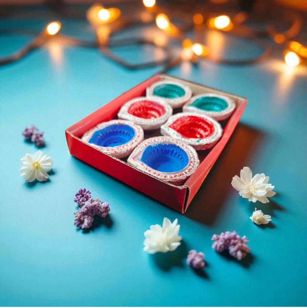 This is a set of traditional Indian earthen lamps, known as diyas, crafted from terracotta (baked clay). Each piece is hand-painted with vibrant, festive colors and often adorned with intricate designs, glitter, or embellishments. Primarily used as oil lamps, these diyas are essential for Hindu festivals, most notably Diwali (the Festival of Lights), symbolizing the triumph of light over darkness and the ushering in of prosperity and knowledge.