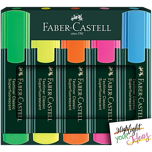 This is a set of Faber-Castell Textliner Classic Superfluorescent highlighters. These are classic-style marker pens designed for highlighting text on paper with vibrant, fluorescent ink.