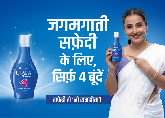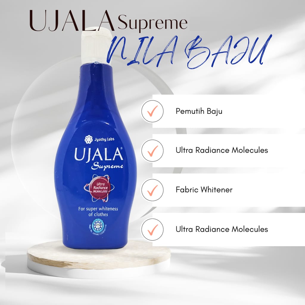 Ujala Supreme is a liquid fabric whitener, also known as a liquid blue or optical brightener, used in the final rinse of laundry for white clothes. Its purpose is to counteract the slight yellowing or dullness that white fabrics develop over time, making them appear a dazzling, super white and bright.