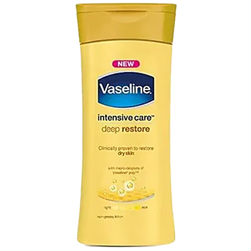 This is the Intensive Care Deep Restore Body Lotion from the brand Vaseline. It is a daily moisturizer formulated specifically to restore dry skin. The product is clinically proven to provide deep moisturization, helping to heal and nourish the skin from within. A key feature of its formula is the inclusion of micro-droplets of Vaseline® Jelly™, which helps to lock in moisture. Despite its deep restoring capabilities, it is designed to be a non-greasy lotion, making it comfortable for everyday use.