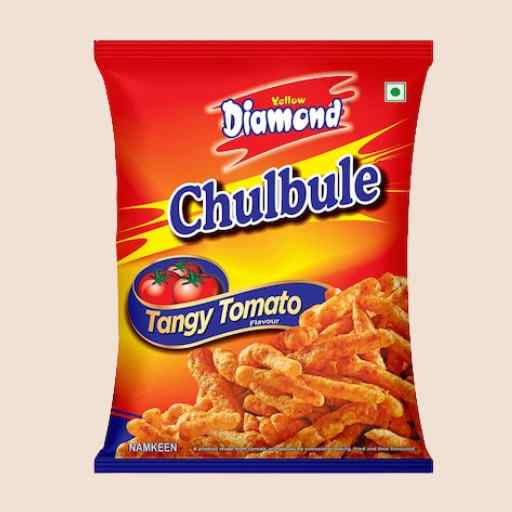 Chulbule Tangy Tomato is a brand of crunchy, savory snack with a bold tomato flavor. The snack appears to have a tubular or irregular, puffed, fried texture, similar to popular Indian snack namkeens.